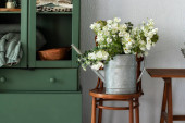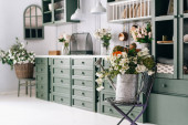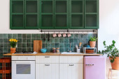 Pionowe ujęcie wysokiej zielonej szafki vintage ze szklanymi drzwiami zawierającymi coś innego na każdej półce, meble kuchenne z naczyniami i talerzami