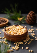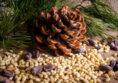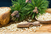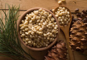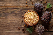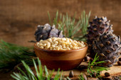 Orzechy sosnowe i szyszki cedrowe na wiejskim drewnie