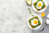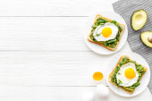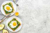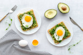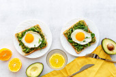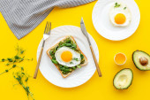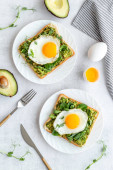 Otwarta kanapka z awokado kremem szpinakowym i jajkami. Widok z góry