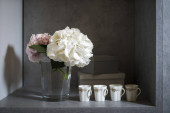 Banda puszystych dmuchawców w kolbie chemicznej, pusta ramka na zdjęcia, filiżanka kawy espresso i głowa Davida na białej szufladzie. Przestrzeń kopiowania