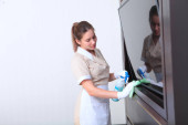 Asystent dentysty wyciera sprzęt do wybielania zębów. Dezynfekcja w klinice dentystycznej. Koncepcja opieki zdrowotnej. Ręce w rękawiczkach ochronnych.
