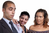 zespół w studiu, kobieta bierze pieniądze od człowieka poket