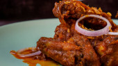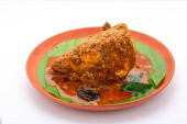 Kurczak gotowane w suchej pikantne czerwone curry ozdobione cebuli pierścień i zielone chili.