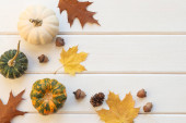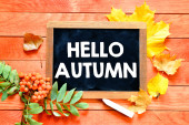 Jesienna pocztówka z produktami sezonowymi i napisem Hello Autumn z liter drewnianych. Dynie, winogrona, figi, jabłka, szyszki sosnowe, orzechy włoskie i liście klonu. Widok z góry, płaski