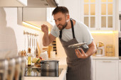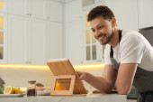 Zdjęcie "Człowiek cięcia kurczaka filet podczas oglądania online gotowania kurs za pomocą tabletu w kuchni" może być wykorzystywane do celów osobistych i komercyjnych zgodnie z warunkami zakupionej licencji Royalty-free. Obraz jest dostępny do pobrania w jakości wysokiej rozdzielczości do 5760x3840.