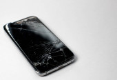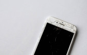 Uszkodzony smartfon na białym drewnianym stole, widok z góry z miejscem na tekst. Naprawa urządzenia