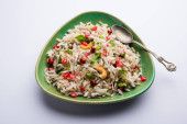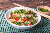 Mieszać smażony ryż z wieprzowiną i warzywami oraz posiekaną papryką i ziołami w misce z pałeczkami