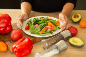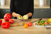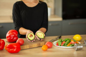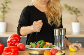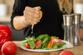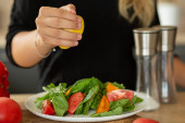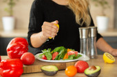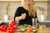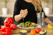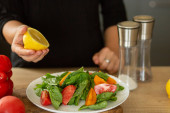 PREPARING SALAD IN THE KITCHEN, hands squeeze cytryna, pomidory, kuchnia, awokado