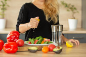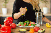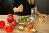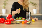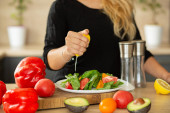 PREPARING SALAD IN THE KITCHEN, hands squeeze cytryna, pomidory, kuchnia, awokado