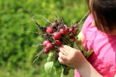 Baby girl gospodarstwa marchewki w ogrodzie dziecko jedzenie zdrowe jedzenie styl życia wegańskie organiczne surowe warzywa domu uprawiane lato koncepcji ogrodnictwa