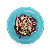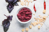Miska ze smacznym hummusem buraczanym i świeżych kiełków na tle koloru
