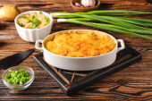 Naczynie do pieczenia ze smacznym zapiekanką ziemniaczaną na drewnianym tle