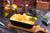 Naczynie do pieczenia ze smaczną zapiekanką ziemniaczaną na ciemnym tle