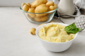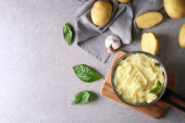 Zdjęcie "Skład ze smacznymi tłuczonymi ziemniakami na jasnym tle" może być wykorzystywane do celów osobistych i komercyjnych zgodnie z warunkami zakupionej licencji Royalty-free. Obraz jest dostępny do pobrania w jakości wysokiej rozdzielczości do 5760x3840.