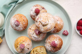 Płyta ze smacznymi malinowymi babeczkami na jasnym tle