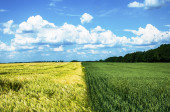 krajobraz pola pszenicy i błękitne niebo z białymi chmurami