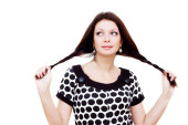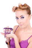 kobieta w czerwonej sukience przytrzymanie pudełko biały