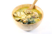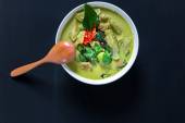 Patelnia z smacznym zielonym curry kurczaka na białym tle