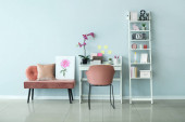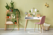 Zdjęcie "Wnętrze stylowego miejsca pracy z kwitnącymi gałęziami w pobliżu ściany koloru" może być wykorzystywane do celów osobistych i komercyjnych zgodnie z warunkami zakupionej licencji Royalty-free. Obraz jest dostępny do pobrania w jakości wysokiej rozdzielczości do 5760x3840.