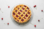 Talerz ze smacznym plackiem wiśniowym i filiżanką herbaty na grunge tle