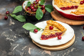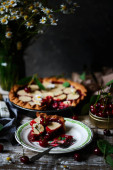 Talerz z kawałkiem smacznego placka wiśniowego na ciemnym drewnianym stole