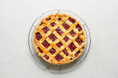 Deska ze smacznym plackiem wiśniowym na tle koloru