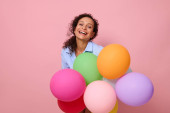 szczęśliwy Azji kobieta w wzorzysty bluzka gospodarstwa w kształcie serca balon na różowym tle