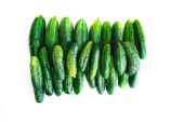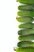Tło zielonych świeżych ogórków. Ogórki leżą dokładnie w rzędzie na białym tle. Naturalna faktura. Przemysł rolny. Zbiory.