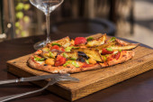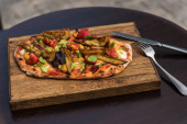 Ręka kobiety trzyma drewnianą tacę z pinsa hummus i szkliwione bakłażany