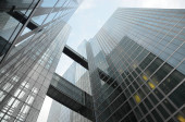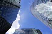 Wysokie budynki w dzielnicy finansowej w letni dzień.
