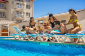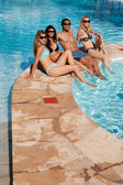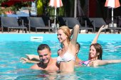 młody człowiek i dwie dziewczyny piją szampana w basenie