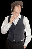 młody człowiek palenia z strzeżony wygląd. na czarnym tle