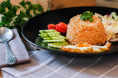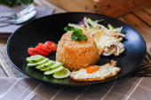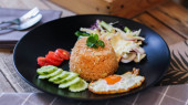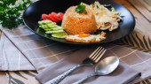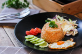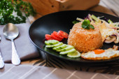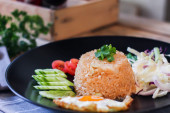 Smażony ryż, jajko smażone, ogórek, pomidor w plasterkach, sałatka zielona i smażony kurczak umieszczone na czarnym talerzu jako przybor.Nazywamy tajskie "kao pad American"