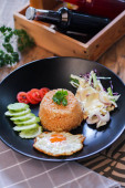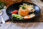 Zdjęcie "Smażony ryż, jajko smażone, ogórek, pomidor w plasterkach, sałatka zielona i smażony kurczak umieszczone na czarnym talerzu jako przybor.Nazywamy tajskie "kao pad American"" może być wykorzystywane do celów osobistych i komercyjnych zgodnie z warunkami zakupionej licencji Royalty-free. Obraz jest dostępny do pobrania w jakości wysokiej rozdzielczości do 5760x3840.