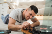 Szczęśliwy człowiek słuchający muzyki z gramofonem w domu