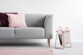 Stylowe wnętrze pokoju z puf, fotel i elementy dekoracyjne. Miejsce na tekst