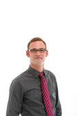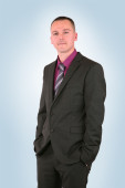 młody biznesmen w garnitur, trzymając ręce w kieszeniach, na białym tle