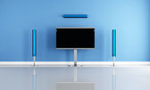 Panorama eleganckiego i prostego czarnego zlewu i stepowania w nowoczesnej kuchni z niebieskimi szafkami i stylowym szarym blatem