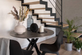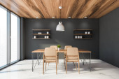 Panorama eleganckiej i stylowej jadalni z długim drewnianym stołem, różne i modne, białe i zielone krzesła i biała ściana z szafkami i drewnianą półką