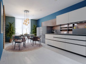 Zdjęcie "Panorama nowocześnie urządzony apartament typu studio z kuchnią z niebiesko-białe szafki otwarte na stylowy salon z żółtą kanapą" może być wykorzystywane do celów osobistych i komercyjnych zgodnie z warunkami zakupionej licencji Royalty-free. Obraz jest dostępny do pobrania w jakości wysokiej rozdzielczości do 5760x3840.