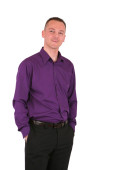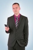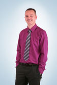 młody biznesmen w garniturze z uśmiechem, na białym tle