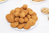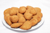 Typowe smażone przystawki z kurczaka z Brazylii o nazwie Coxinhas de Frango odizolowane na białym tle.