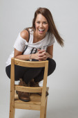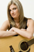 młoda dziewczyna brunetka, opierając się na gitarze