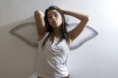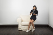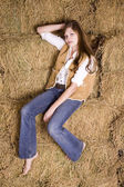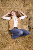 młoda brunetka kobieta siedzi na bele siana i grając ukulele zabawka z głową w dół