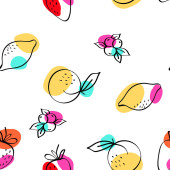 Pink and Yellow Orange and Berry Vector White Seamless Pattern. Sketch Lemon and Strawberry Texture. Blue and Red Apple and Peach Drawing Wallpaper.