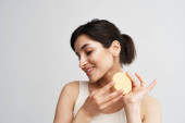 ładna brunetka w białym T-shircie z gąbką w rękach i kosmetyki dla zdrowia czysta skóra