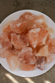 Bloki różowej soli himalajskiej na białej płycie wycinanki.