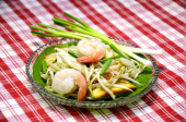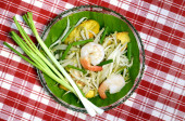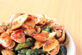 mieszać smażone małże z pieczonymi chili wklej i bazylii tajskiej.