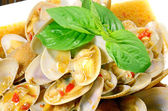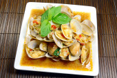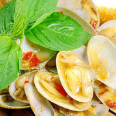 mieszać smażone małże z pieczonymi chili wklej i bazylii tajskiej.
