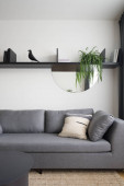 Zdjęcie "Panorama eklektycznego salonu z nowoczesnym czarnym stołem jadalnym z krzesłami, stylową kanapą, stołem kawowym i dekoracjami oraz dużą, zabytkową szafą" może być wykorzystywane do celów osobistych i komercyjnych zgodnie z warunkami zakupionej licencji Royalty-free. Obraz jest dostępny do pobrania w jakości wysokiej rozdzielczości do 5760x3840.